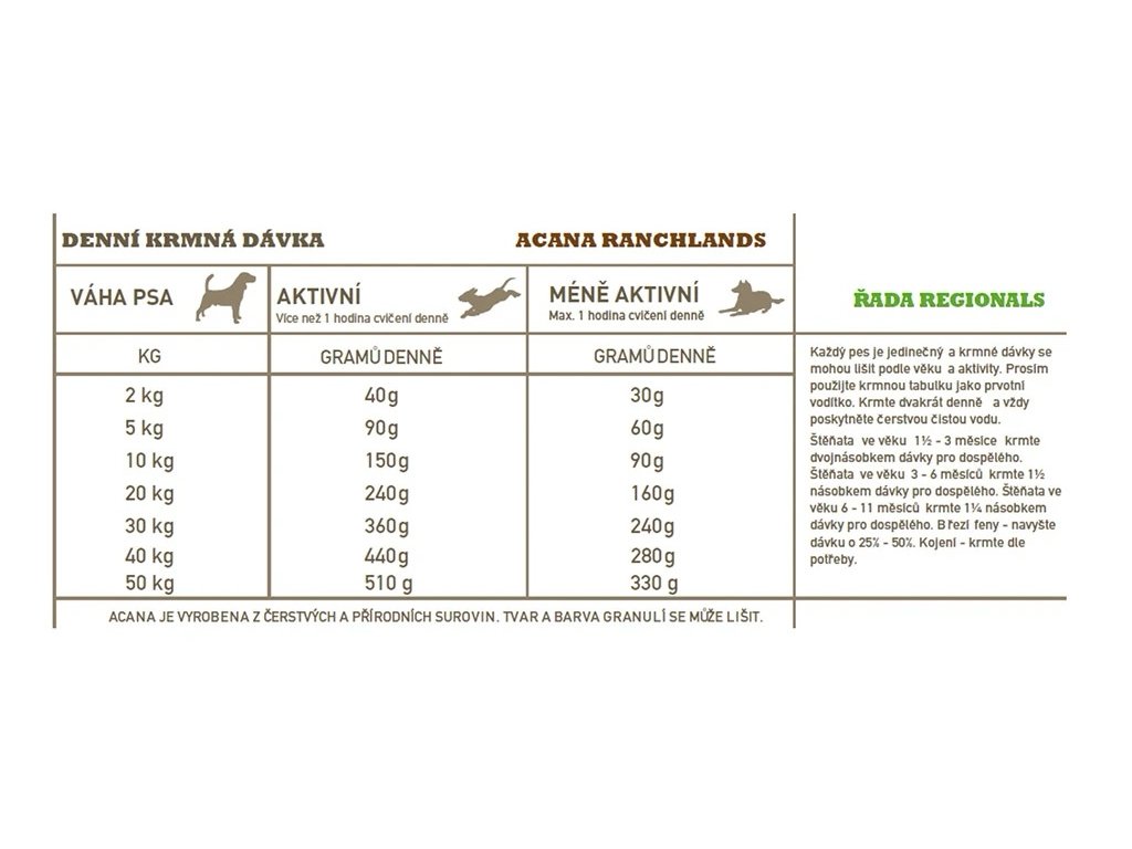 NÁVOD K POUŽITÍ: Podávejte suché nebo navlhčené vodou. Denní dávka se bude lišit podle věku, velikosti, výkonu a prostředí. Doporučené denní dávkování je uvedené v krmné tabulce. Pokud podáváte krmivo Acana poprvé, v prvním týdnu podávejte smíchané s původním krmivem a postupně navyšujte podíl Acany v celkové denní dávce.