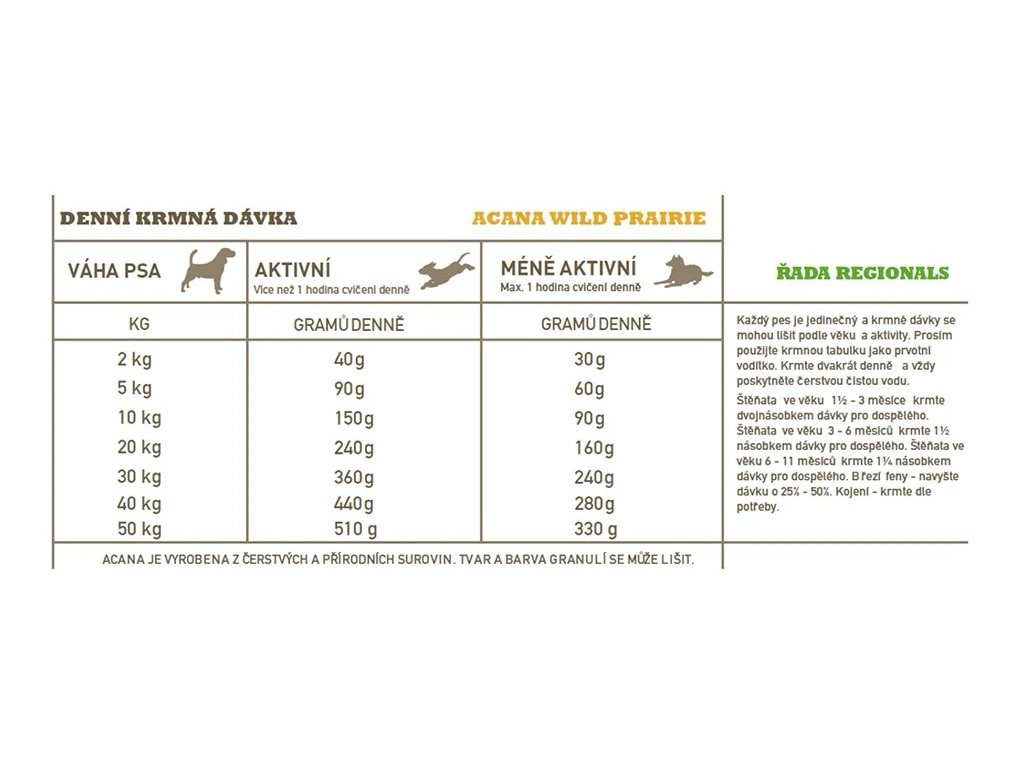 NÁVOD K POUŽITÍ: Podávejte suché nebo navlhčené vodou. Denní dávka se bude lišit podle věku, velikosti, výkonu a prostředí. Doporučené denní dávkování je uvedené v krmné tabulce. Pokud podáváte krmivo Acana poprvé, v prvním týdnu podávejte smíchané s původním krmivem a postupně navyšujte podíl Acany v celkové denní dávce.