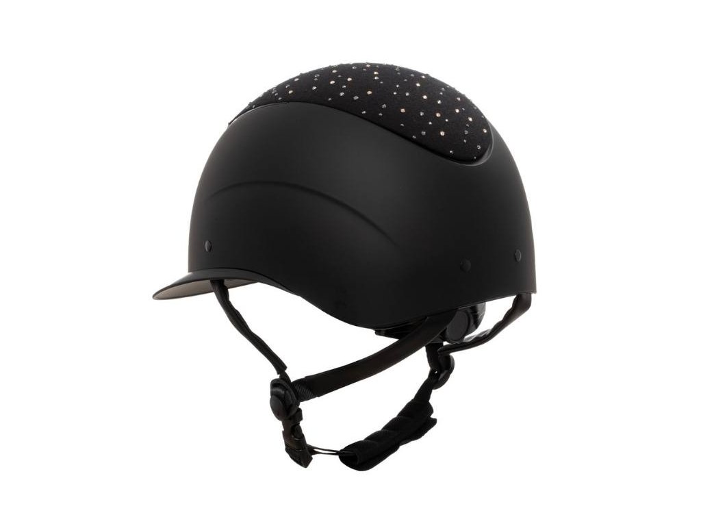 Má matnou vnější skořepinu zdobenou kamínky, které na ventilačním otvoru vytvářejí logo Equestro. Tento detail spolu s lesklým rámem dodává helmě elegantní a zároveň vytříbený vzhled typický pro produkty značky Equestro.