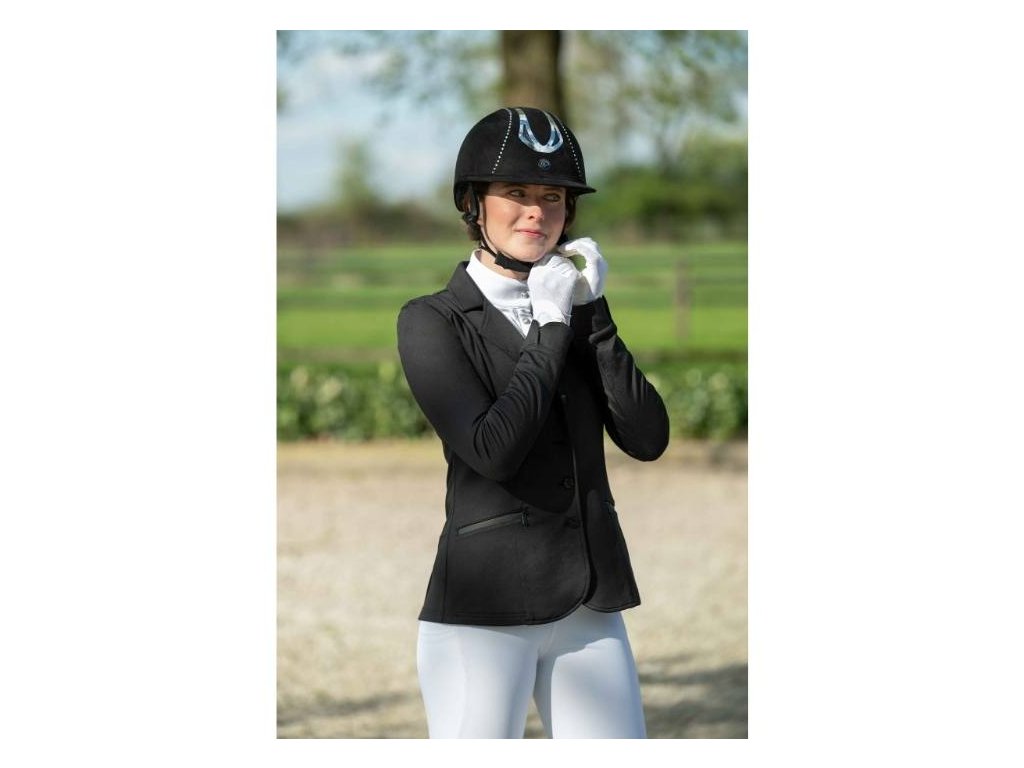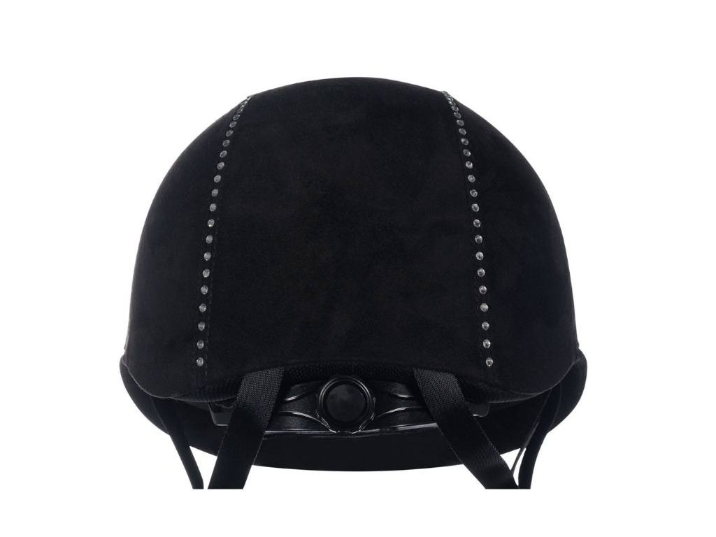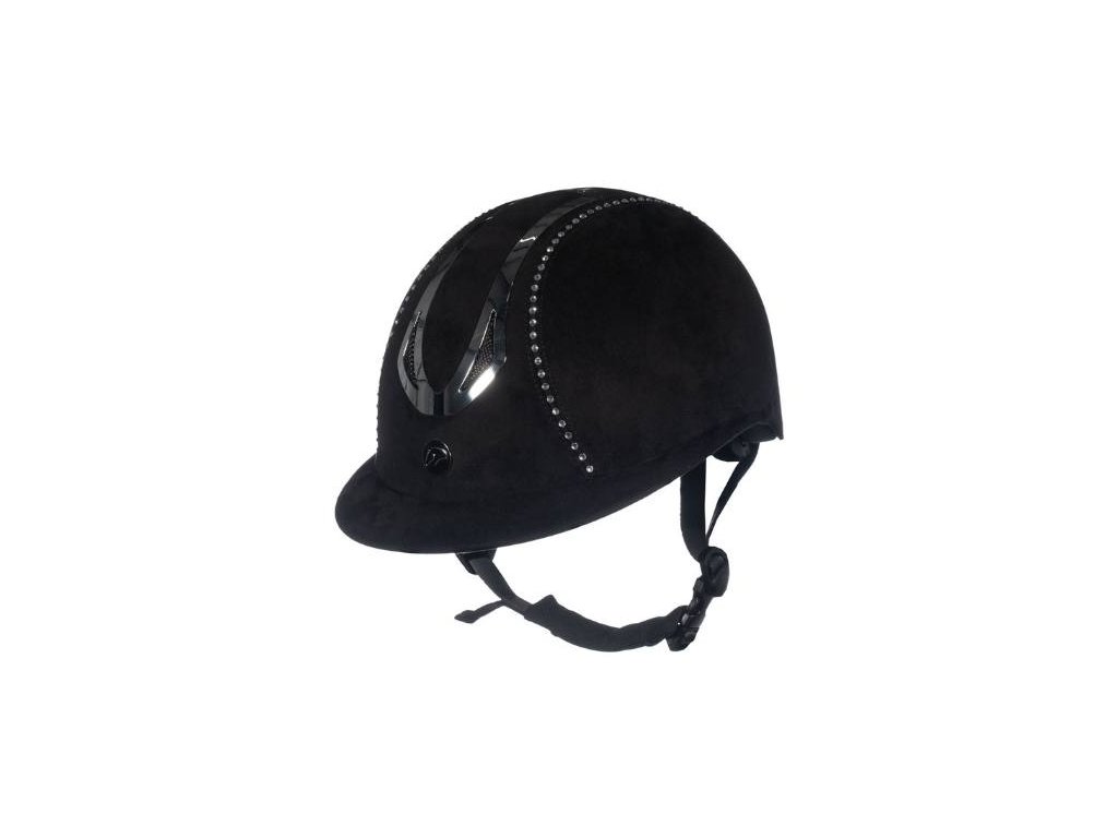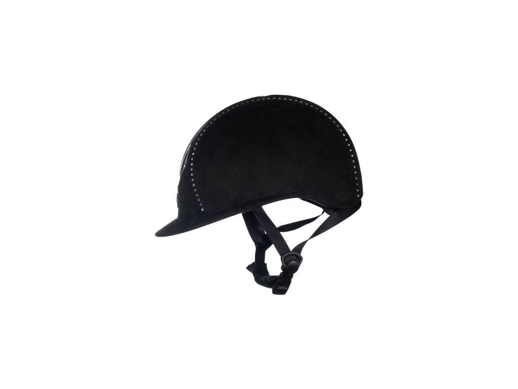 Elegantní bezpečností helma se semišovým vzhledem doplněným kamínky. Helma splňuje Evropskou normu EN 1384:2023, takže jezdci zaručuje maximální úroveň bezpečnosti. Účinný ventilační systém umožňuje dobrou cirkulaci vzduchu, měkké vnitřní polstrování zaručuje komfortní nošení a pohodlí. Kolečko v zadní části helmy slouží k nastavení velikosti a individuálnímu přizpůsobení každému tvaru hlavy. Aby přilba správně držela, je nutné ji nastavit pomocí kolečka a zapínání pod bradou tak, aby byl její pohyb na hlavě minimální. Helma je dodávána v praktickém látkovém pytlíku vhodném pro skladování.