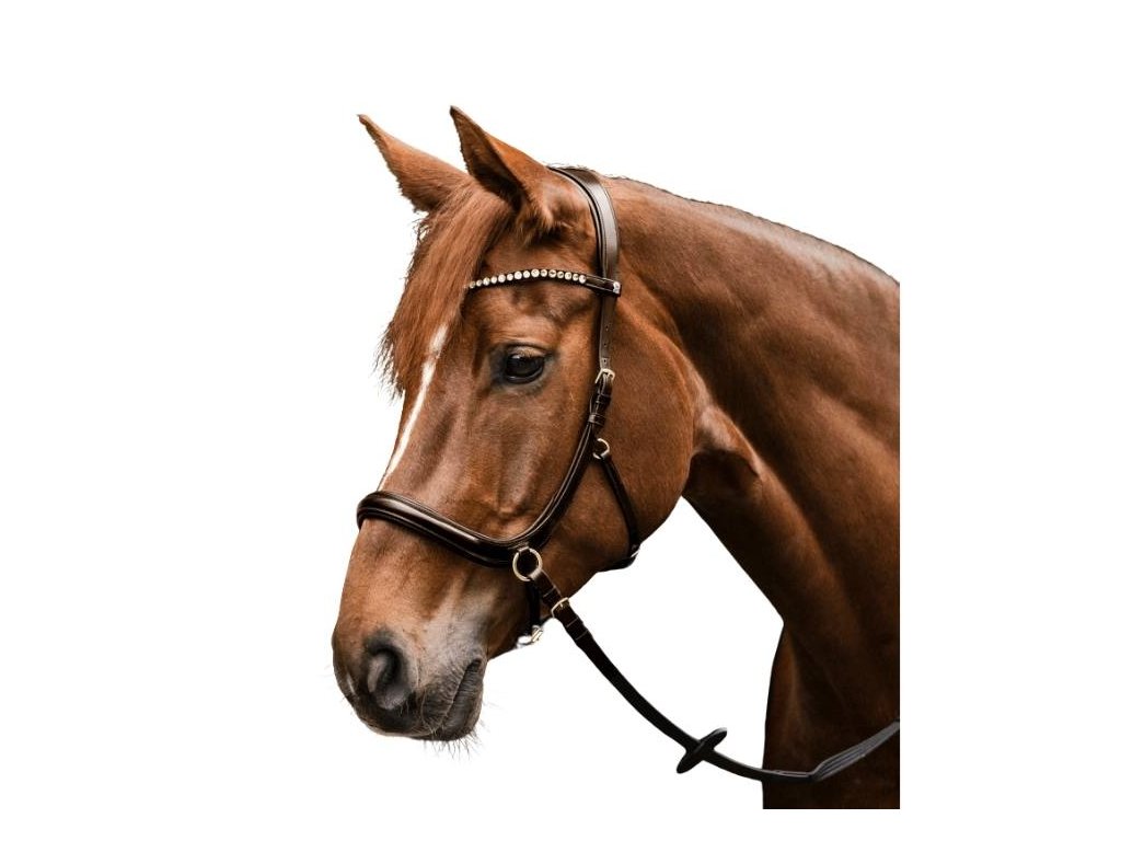 Bezudidlová uzdečka z prémiové řady X-Line od výrobce Waldhausen. S dvěma kroužky na nánosníku pro přichycení otěží. Anatomicky tvarovaný nátylník a nánosník, uzdečka tak dobře rozkládá tlak. Se zahnutou čelenkou s kamínky. Dodáváno včetně otěží.