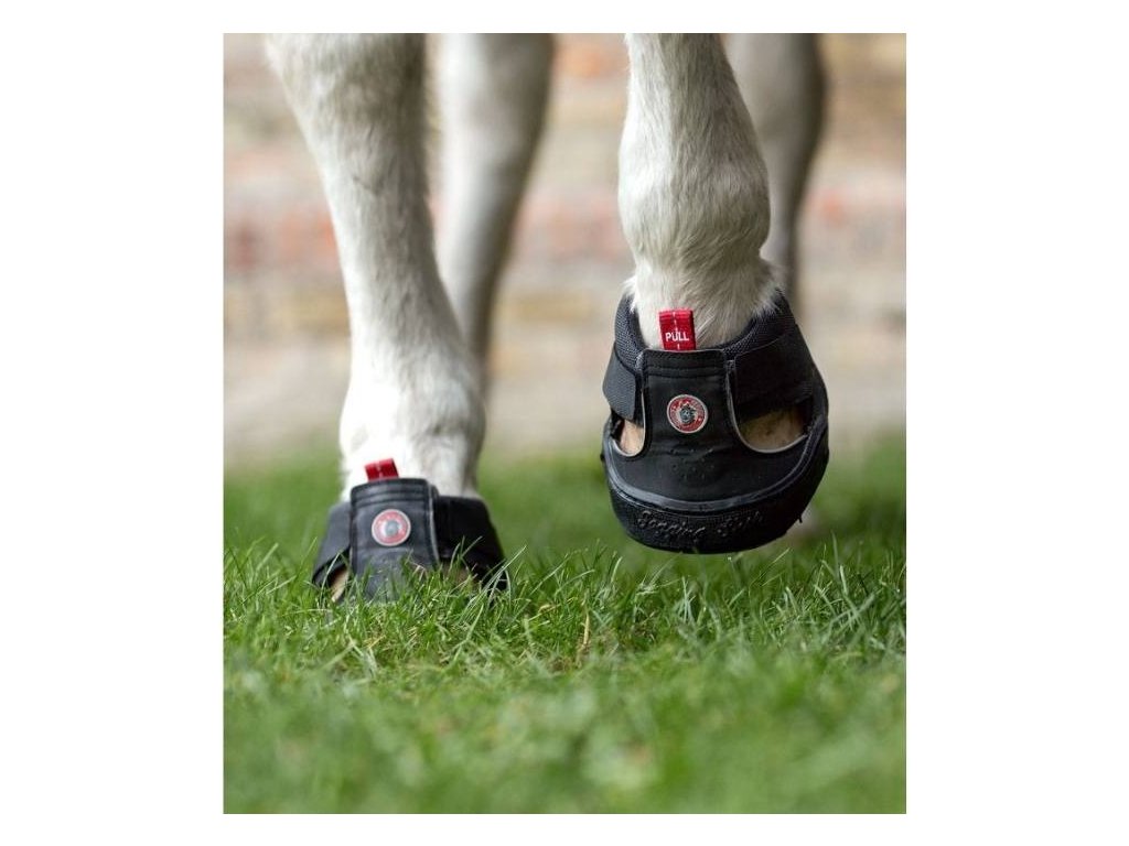 Díky přizpůsobitelné vrchní části a systému zapínání lze botu pevně upevnit kolem kopyta, aby zůstala na svém místě. Bota je vhodná i pro pohyb ve výběhu/paddocku.