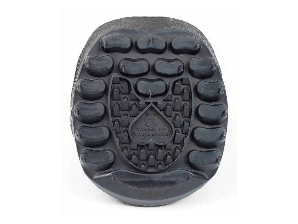 Bota pro koně od Equine Fusion® se vyznačuje flexibilitou a měkkým pocitem. Skládá se ze známé podrážky All Terrain s unikátním vzorkem, který nabízí výbornou přilnavost s optimální trakcí, skvělé odpružení a stabilitu. Vrchní část boty je vyrobena z materiálu Superfabric, který je prodyšný a rychleschnoucí. Je odolný, flexibilní a chrání proti poškrábání, opotřebení a poškození. Konstrukce patky zároveň umožňuje neomezený přirozený pohyb kopyta. Slim verze má užší střih.