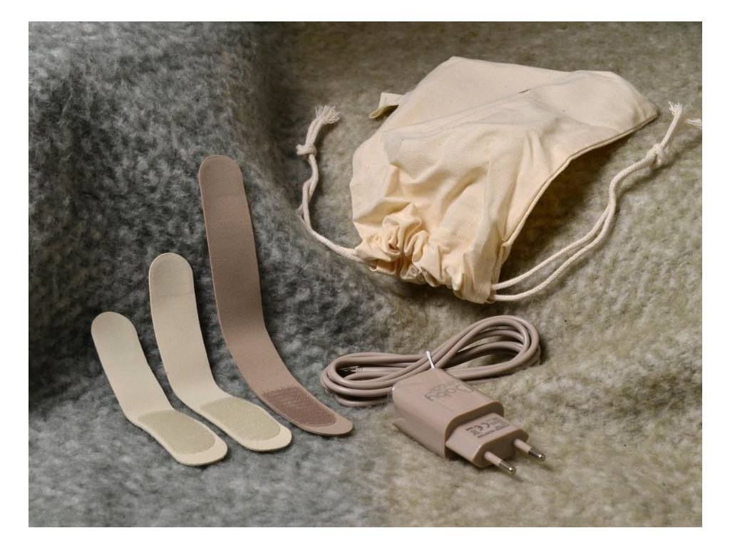 BALENÍ: Senzor ruka/noha (BS01), Měkké senzorové pásky – 3 velikosti, Základní stanice / Smart Gateway (BG01), USB nabíječky a kabely, Cestovní pouzdro z organické bavlny