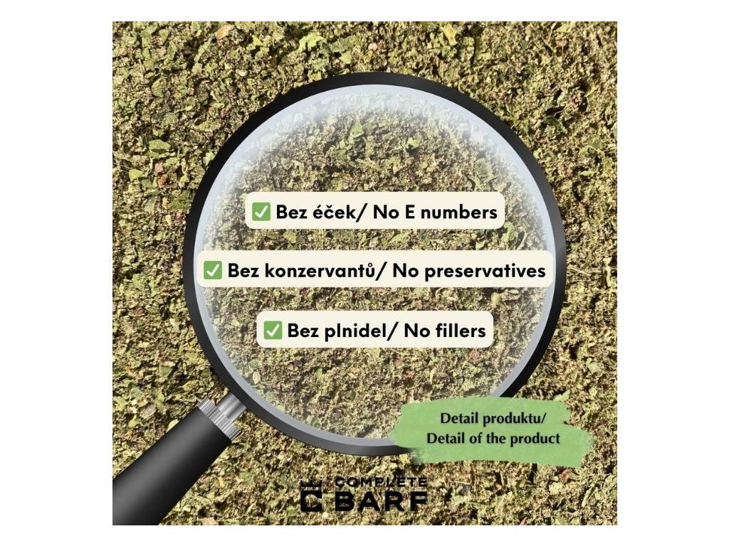 SLOŽENÍ: alfalfa (Medicago sativa) 20 %, petržel nať, mořská řasa kelpa (Ascophyllum nodosum), pampeliška lékařská list, jablko, borůvka plod, černý rybíz plod, malina plod, lněné semínko, konopné semínko, pšeničné klíčky (bezlepkové), pupalkové semínko, majoránka, oregano, rozmarýn, pivovarské kvasnice