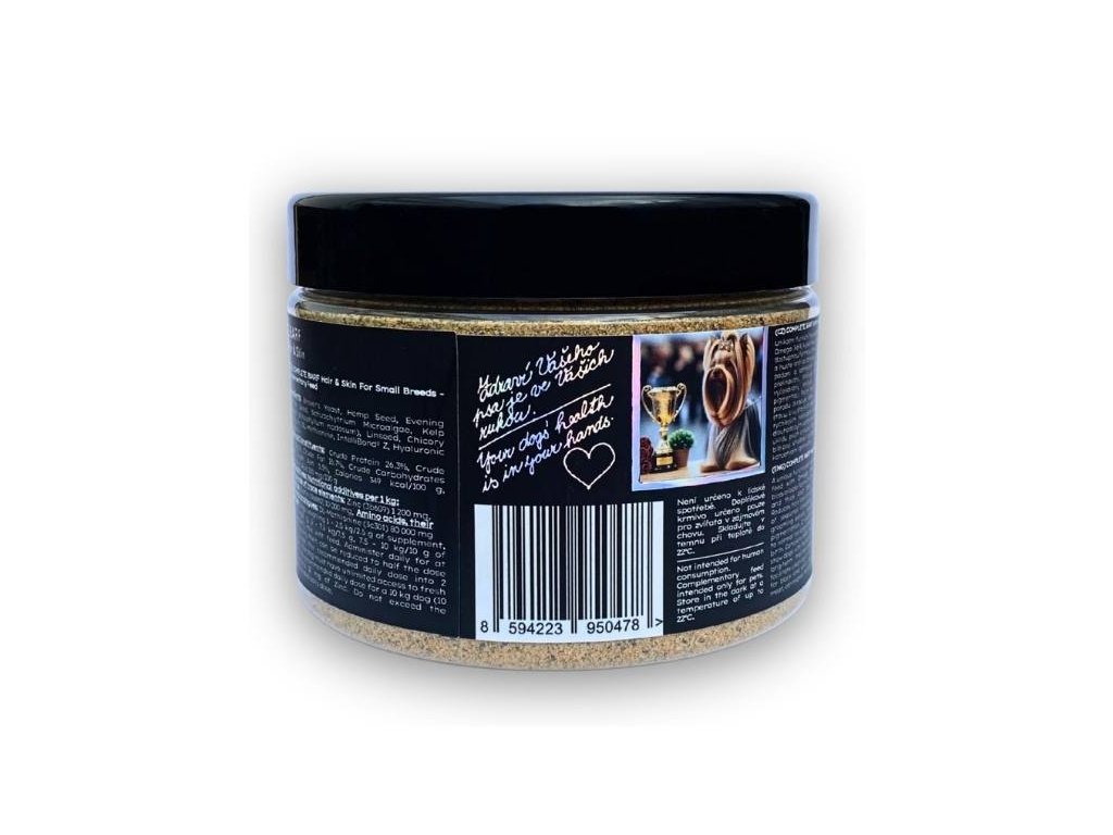- sypký doplněk pro špičkovou podporu krásné a zdravé srsti a kůže psů malých plemen