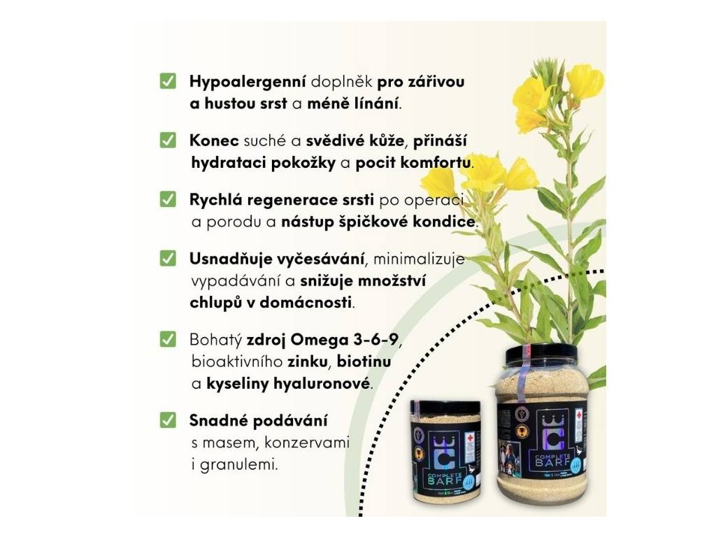 - pomáhá při nadměrném línání, matné srsti či suché a svědivé kůži