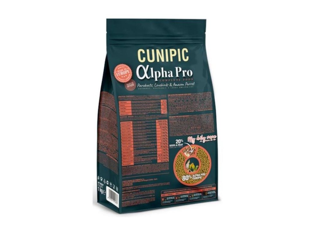 DÁVKOVÁNÍ: Podávejte dle potřeby papouška. V závislosti na druhu a stáří papouška se denní dávka krmiva může značně lišit. Doporučené složení denní dávky je 80 % krmiva Cunipic Alpha Pro a 20 % semen a ovoce.