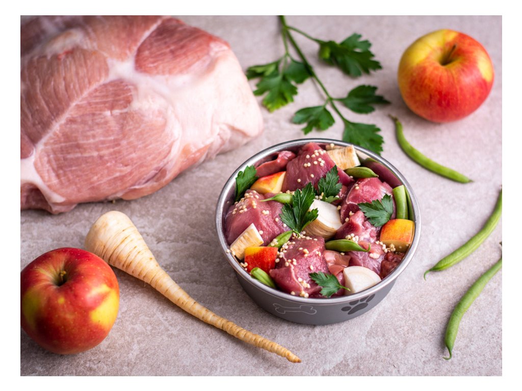 SLOŽENÍ: vepřové maso 55 %, quinoa, jablko, petržel, fazolové lusky, vepřová játra 5 %, petrželová nať, řepkový olej, doplňkové látky