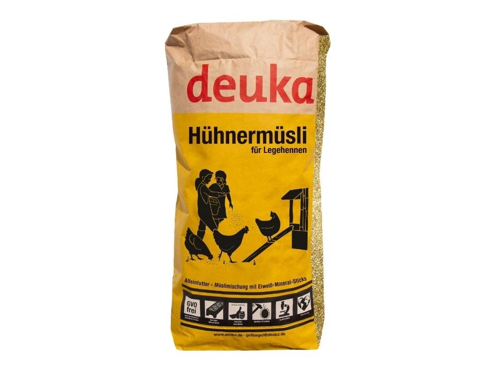 NÁVOD K POUŽITÍ: Kompletní krmivo pro nosnici. V závislosti na plemeni a hmotnosti (např. nosnice s tělesnou hmotností cca 1,5 kg) podávejte cca 125 g Deuka Hühnermüsli na kus a den.