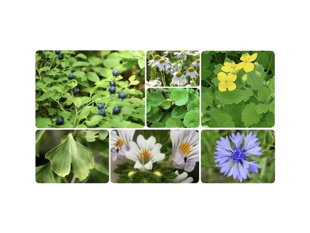 SLOŽENÍ: brusnice borůvka – list (Vaccinium myrtillus), pupečník asijský/gotukola – list (Centella asiatica), vlaštovičník větší – list a nať (Chelidonium majus), heřmánek lékařský – květ (Matricaria chamomilla), chrpa polní – květ (Centaurea cyanus), světlík lékařský – nať (Euphrasia rostkoviana), jinan dvoulaločný/ginkgo – list (Ginkgo biloba)