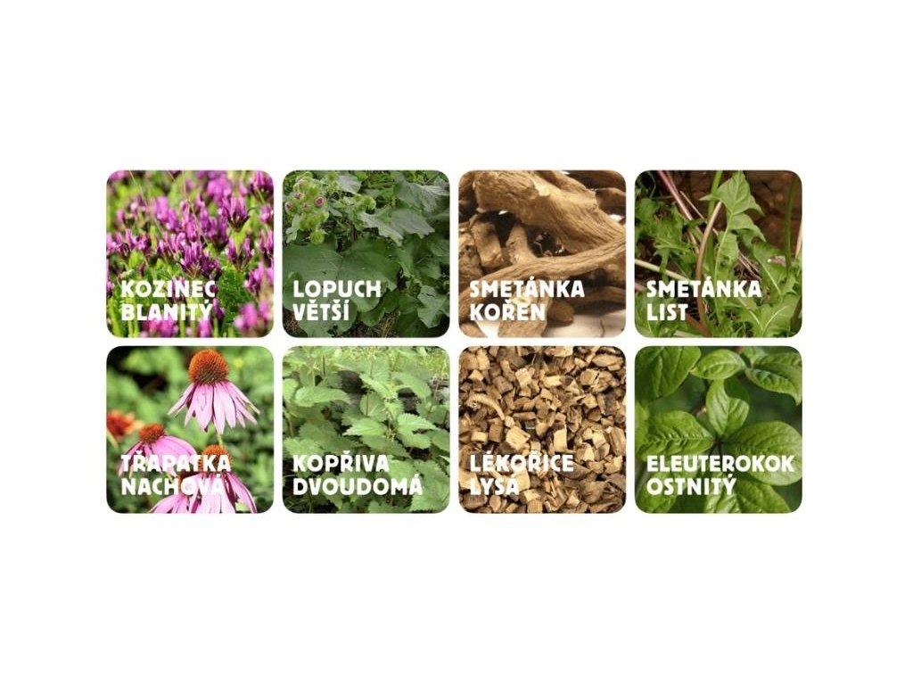 SLOŽENÍ: třapatka nachová/echinacea: Echinacea, lopuch větší – kořen: Arctium lappa, smetánka lékařská – kořen: Symphytum officinale, smetánka lékařská – list: Symphytum officinale, kopřiva dvoudomá – list: Urtica dioica, lékořice lysá – kořen: Glycyrrhiza glabra, eleuterokok ostnitý/sibiřský ženšen: Eleutherococcus senticosus, kozinec blanitý – kořen: Melissa officinalis