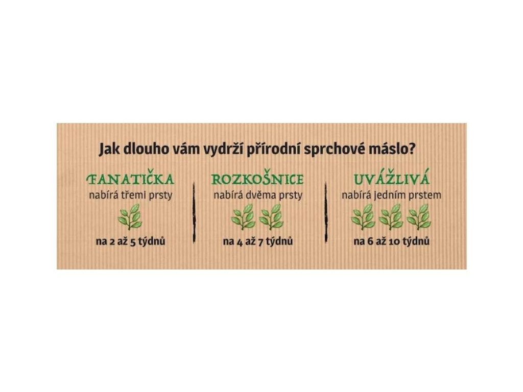 UPOZORNĚNÍ: Doba použitelnosti: 18 měsíců od data výroby. Sprchová másla Dokonalé Lásky jsou přírodní a při jejich výrobě nejsou použity parabeny, SLS, silikony, PPG, PEG, látky ropného původu ani jiné nebezpečné látky, které znáte (nebo většinou spíše bohužel neznáte) z popisu složení na etiketách drtivé většiny koupelových a sprchových přípravků.
