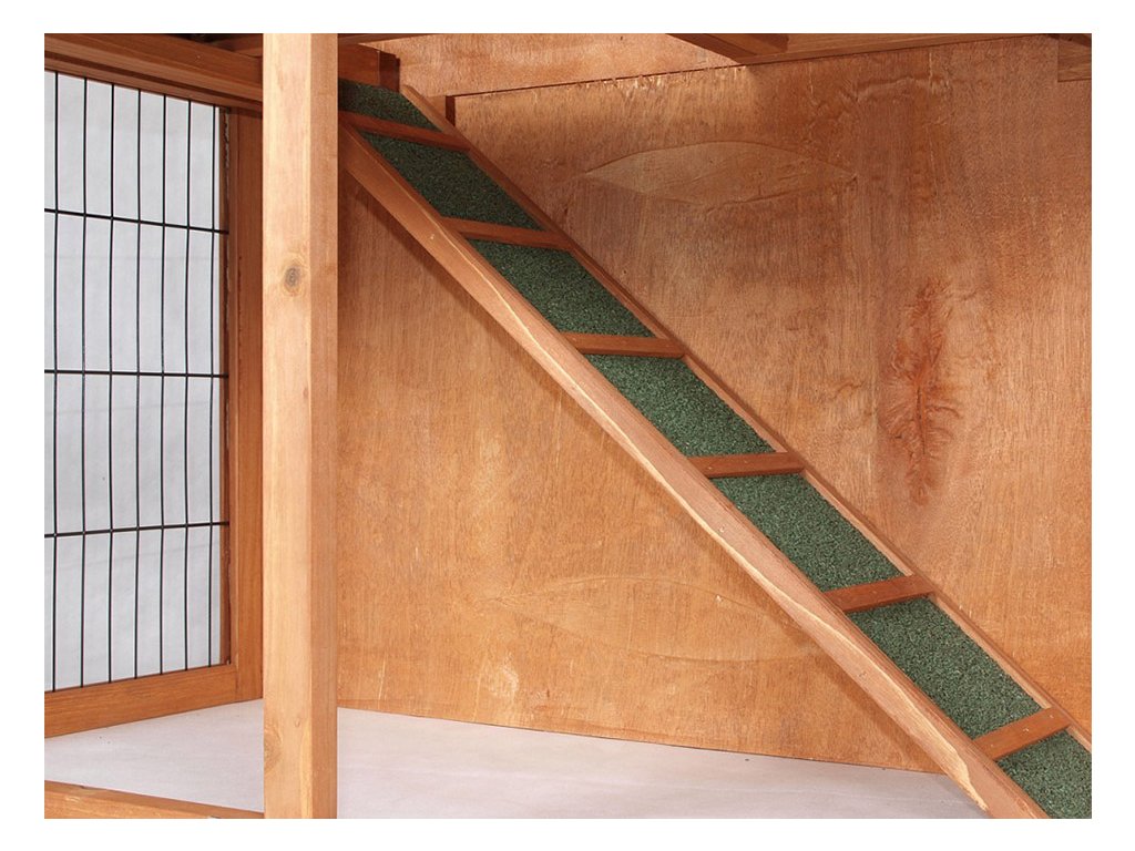 - kvalitní dvoupatrový dřevěný domeček s možností výběhu přímo na trávník