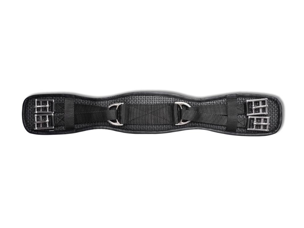 Drezurní podbřišník z měkké mřížkové pěny. Anatomicky tvarovaný a s pohyblivými sponami po obou stranách pro optimální rozložení tlaku a zabránění vzniku tlakových bodů. S nerezovými válečkovými přezkami a bez elastického zakončení.