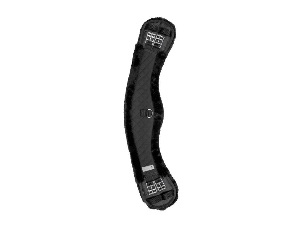 Drezurní podbřišník s měkkou podšívkou ze syntetické kožešiny. Díky svému tvaru je ideální pro koně s kulatějším břichem a pomáhá zabránit posouvání sedla dopředu. S nerezovými přezkami a kroužkem pro pomocné otěže. Bez elastického zakončení.