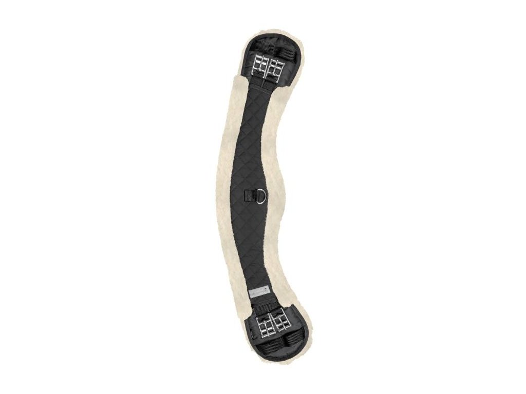 Drezurní podbřišník s měkkou podšívkou ze syntetické kožešiny. Díky svému tvaru je ideální pro koně s kulatějším břichem a pomáhá zabránit posouvání sedla dopředu. S nerezovými přezkami a kroužkem pro pomocné otěže. Bez elastického zakončení.