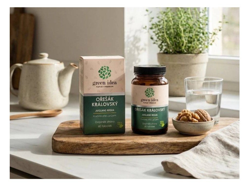 SLOŽENÍ: Juglans regia standardizovaný extrakt list, vitamín C (kyselina L-askorbová), mikrokrystalická celulóza (plnidlo), stearan hořečnatý (plnidlo), tobolka (rostlinná želatina)