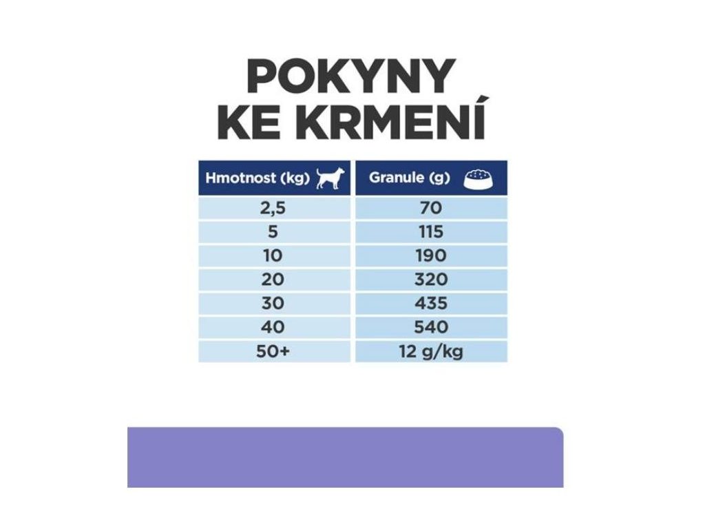 DÁVKOVÁNÍ: Psa krmte výhradně doporučeným krmivem Hill’s Prescription Diet. Výše uvedené doporučené dávkování je pouze orientační. Pokud si nejste jisti, zeptejte se svého veterináře. Přechod na nové krmivo by měl probíhat postupně v průběhu minimálně 7 dní
