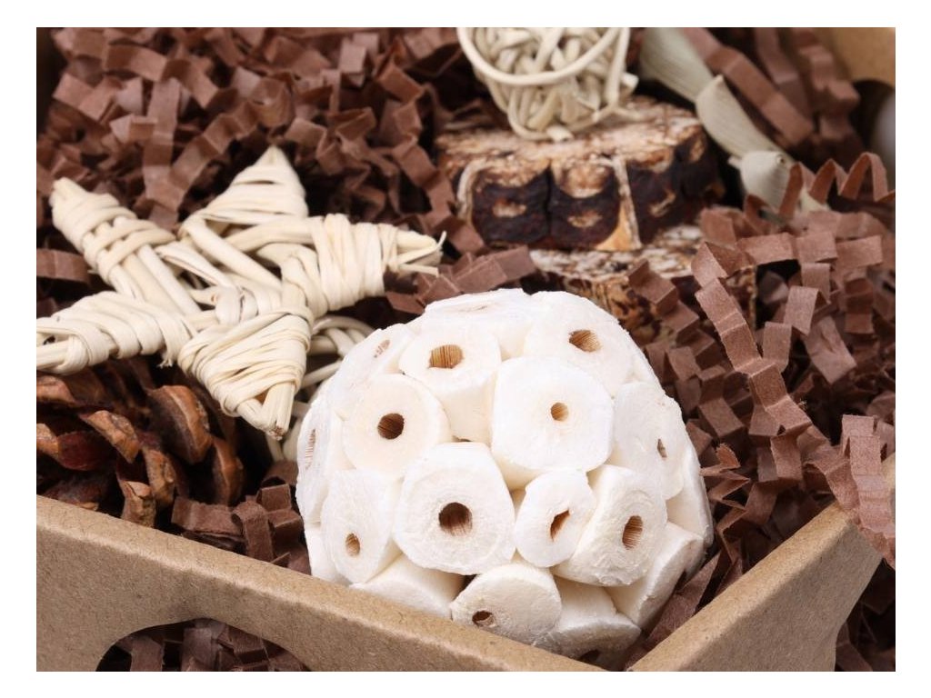 - naplněno senem, kokosem, lufou, mahagonovými lusky, palmovými listy, papírem, ratanem a dřevem sola