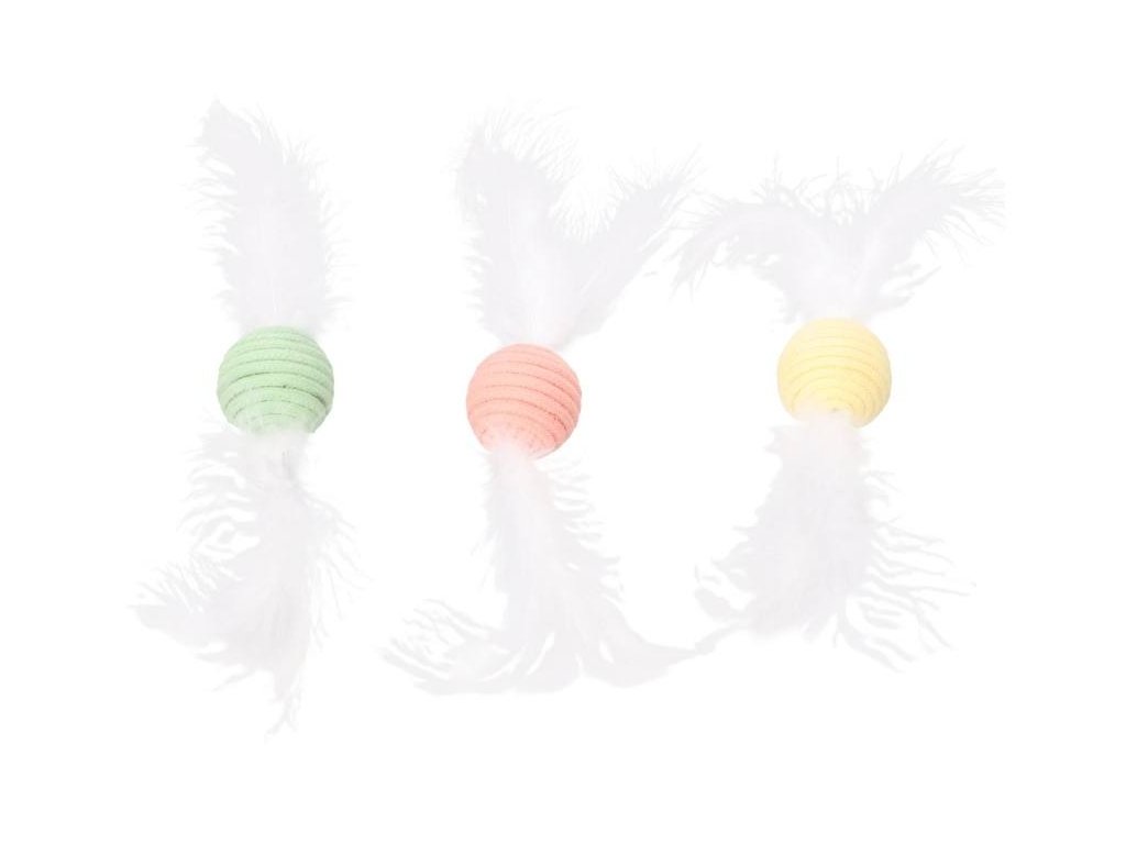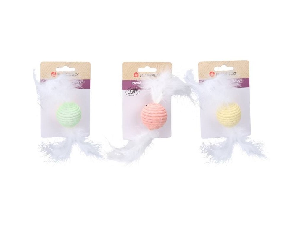 Hračka pro kočky FLAMINGO - Poppy míček s peřím 23x4,5cm (MIX BAREV)