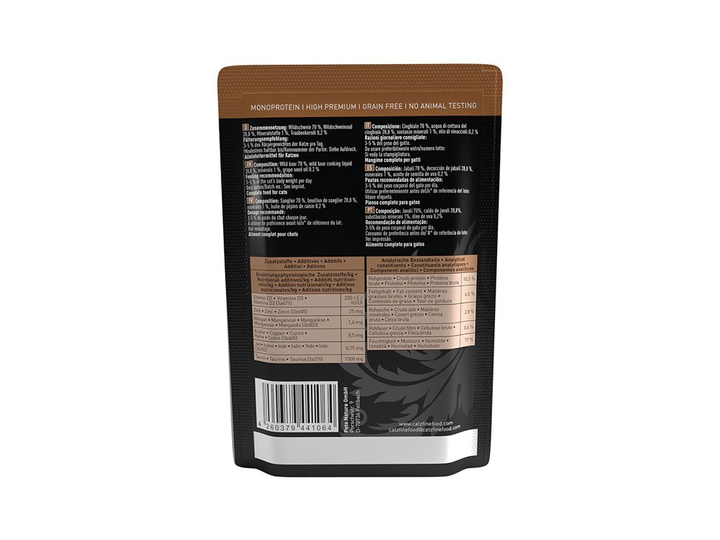Složení: kančí maso 70 %, kančí vývar 28,8 %, minerální látky 1 %, hroznový olej 0,2 %