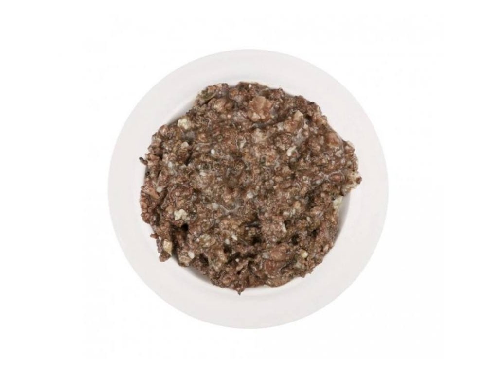 SLOŽENÍ: hovězí maso 60 %, hovězí srdce 25 %, hovězí vývar 11 %, kopřiva 2 %, minerály, prebiotika (FOS, MOS) 1 %
