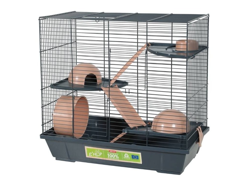 BALENÍ: klec, 2x domeček, 3x přístupová rampa, 1x miska, 1x kolotoč