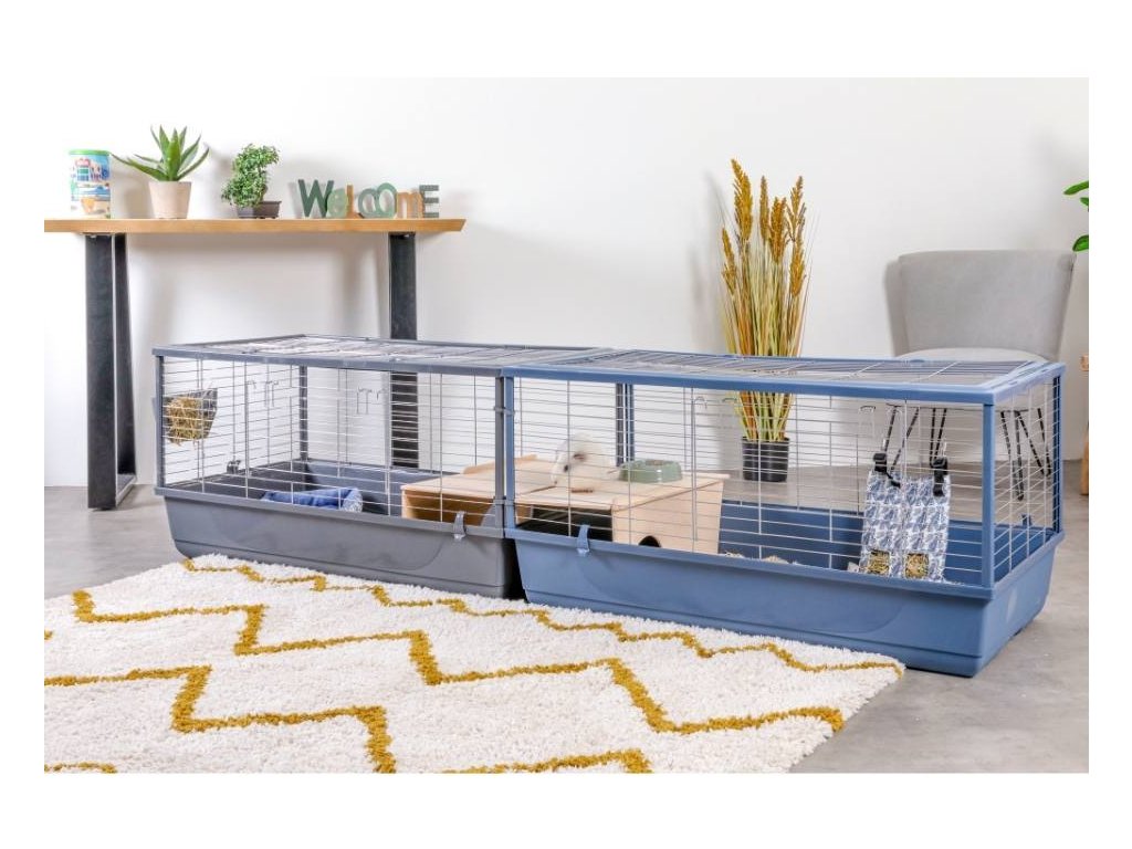 BALENÍ: klec, 2 klipové spojovací díly pro připojení k jiné kleci, 2 zpevňující svorky, které drží dno na místě, když je výběh propojený s další klecí, 1 zásobník na seno z recyklovaného plastu, 1 miska z recyklovaného plastu (150 ml), 1 překližkový domeček s certifikátem FSC® mix; vhodná výška skrýše navržená a schválená veterinářem