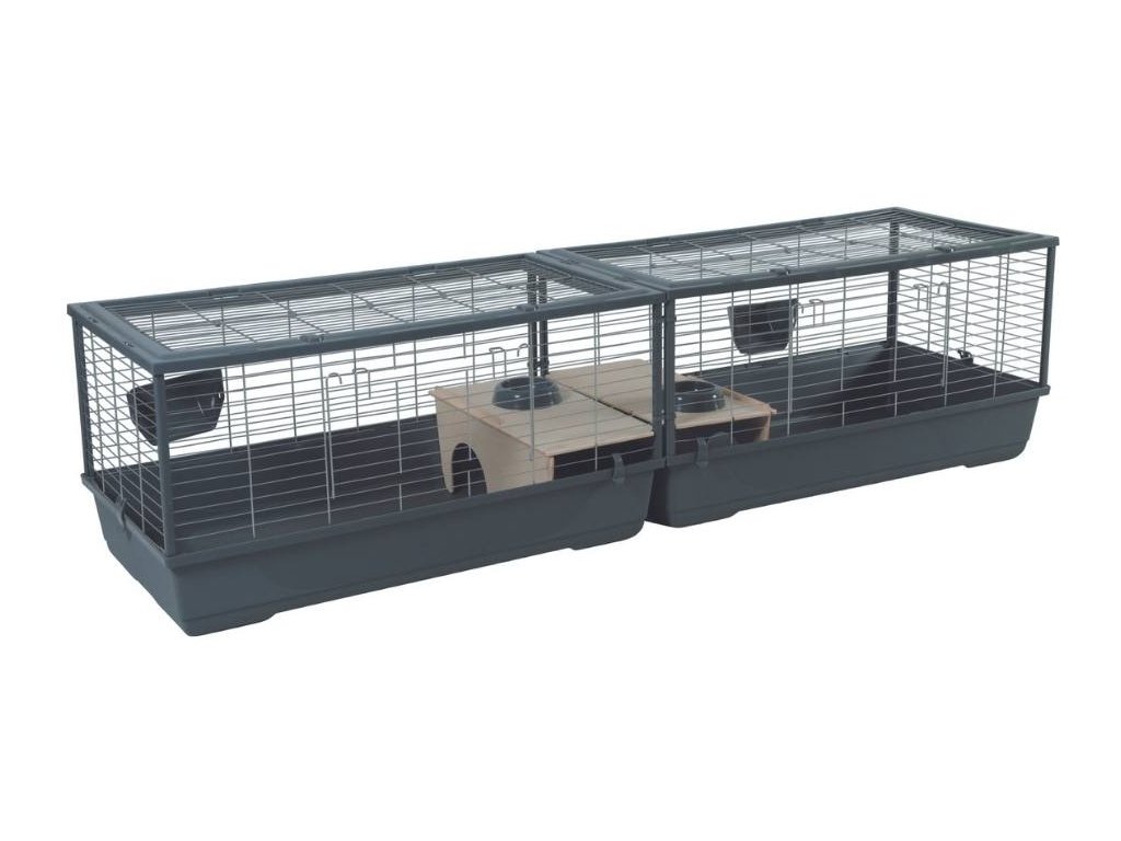 BALENÍ: klec, 2 klipové spojovací díly pro připojení k jiné kleci, 2 zpevňující svorky, které drží dno na místě, když je výběh propojený s další klecí, 1 zásobník na seno z recyklovaného plastu, 1 miska z recyklovaného plastu (150 ml), 1 překližkový domeček s certifikátem FSC® mix; vhodná výška skrýše navržená a schválená veterinářem