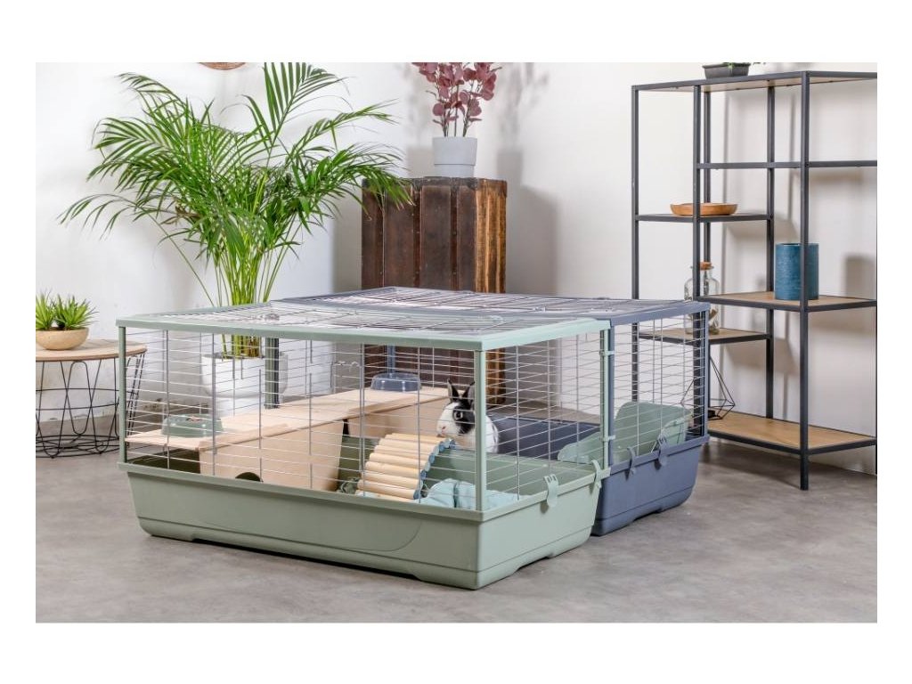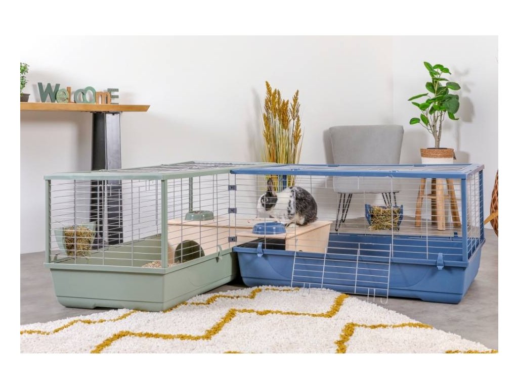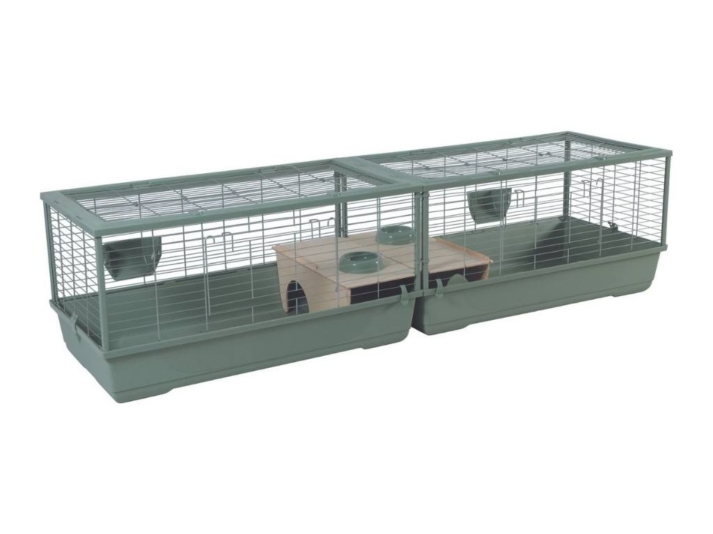 BALENÍ: klec, 2 klipové spojovací díly pro připojení k jiné kleci, 2 zpevňující svorky, které drží dno na místě, když je výběh propojený s další klecí, 1 zásobník na seno z recyklovaného plastu, 1 miska z recyklovaného plastu (150 ml), 1 překližkový domeček s certifikátem FSC® mix; vhodná výška skrýše navržená a schválená veterinářem