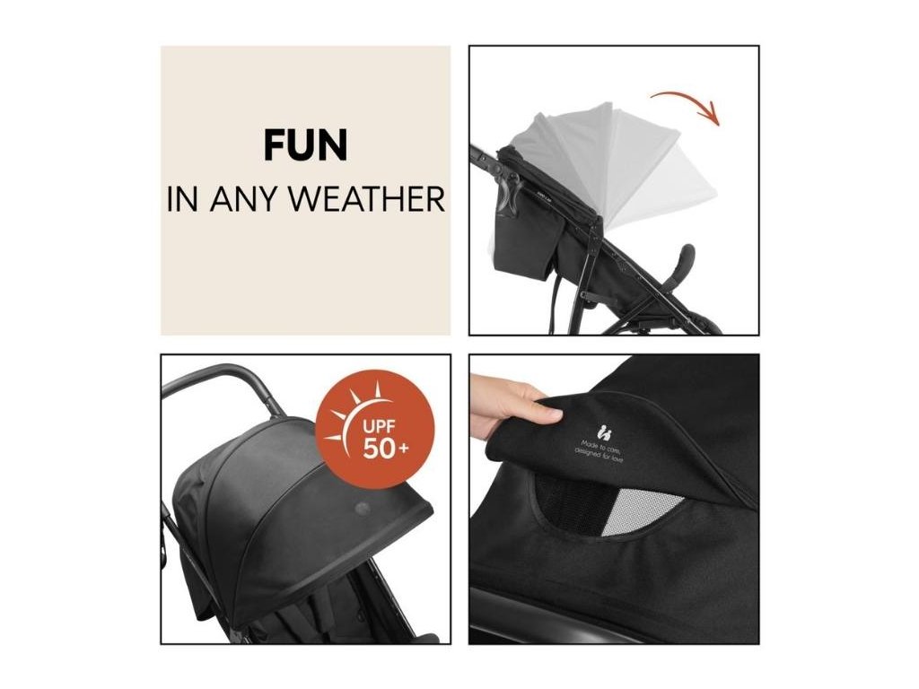 - 4-dílná stříška s UV ochranou 50+ a peek-a-boo okýnkem pro maximální ochranu
