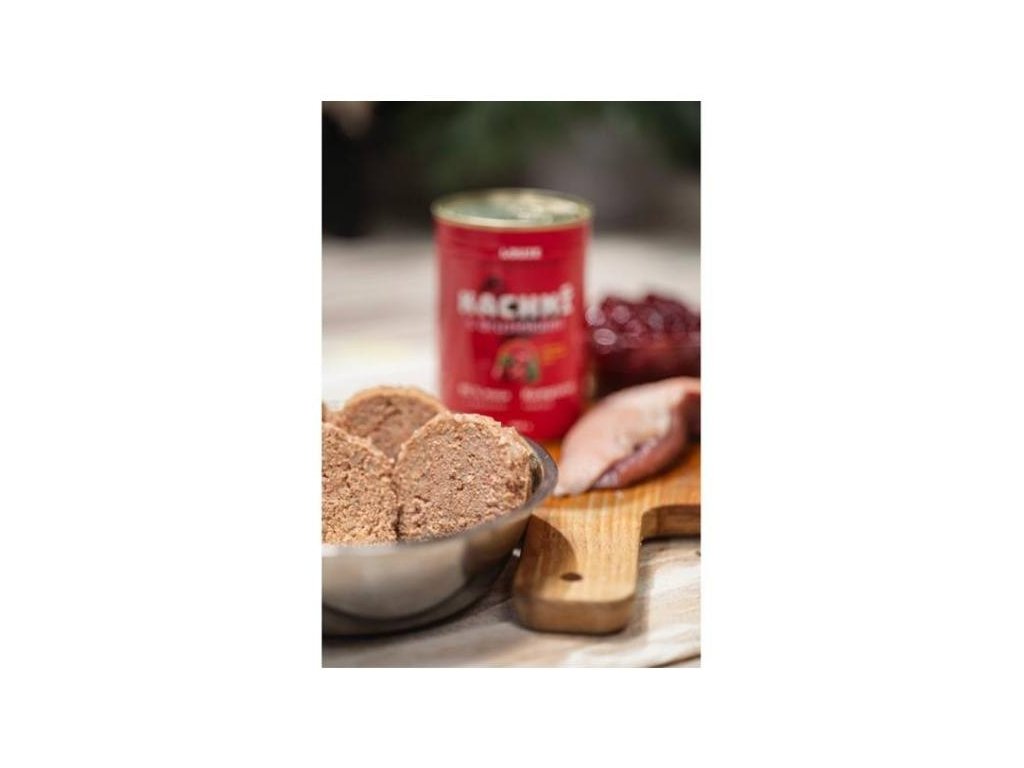 SLOŽENÍ: kachní maso, vývar, změkčené kachní kosti, brusinky, minerály a vitamíny