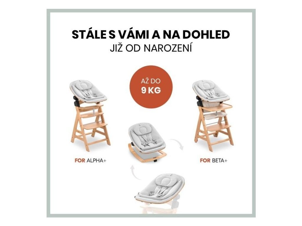 BALENÍ: 5-bodový bezpečnostní pás, návod, dřevěné křesílko, adaptér pro jídelní židličku ALPHA+/BETA+, polstrování pro novorozence