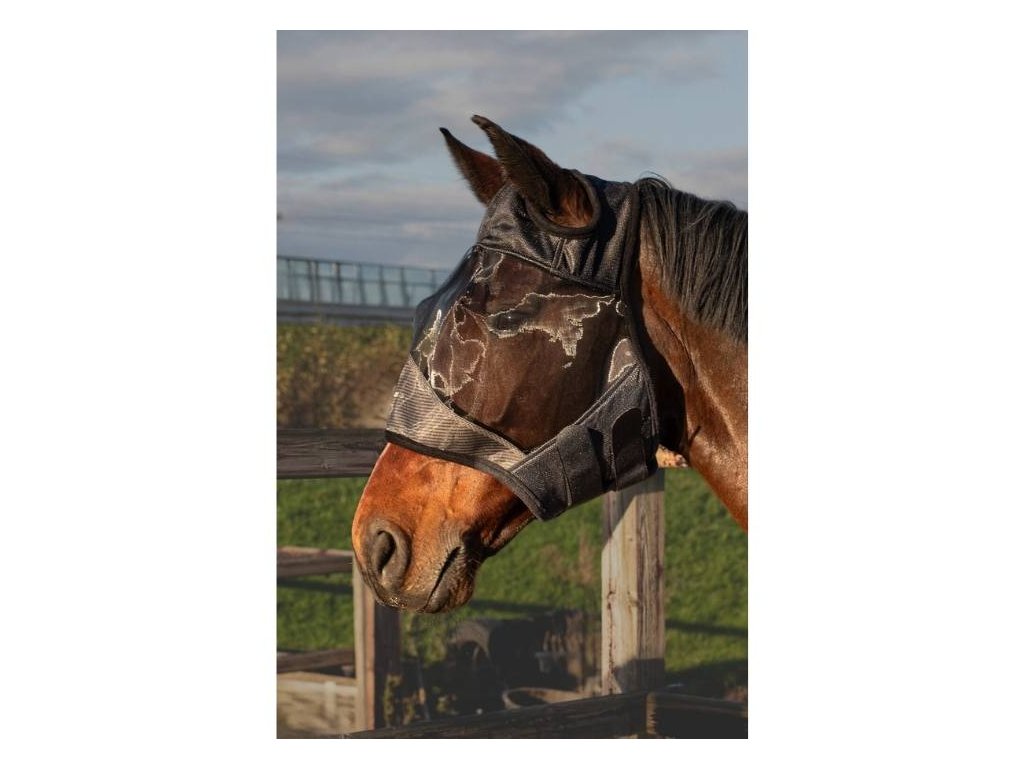 Tato maska proti hmyzu je vybavena tvarovanými záhyby, které zajišťují, že síťovina nesedí přímo na očích a řasách koně.