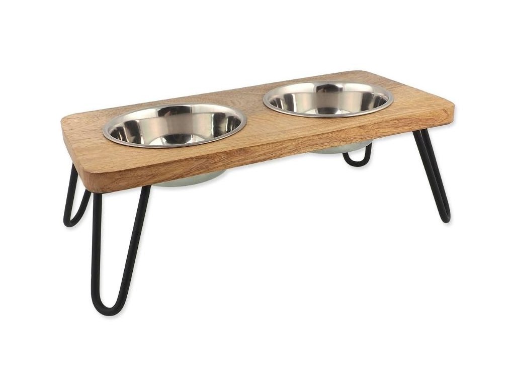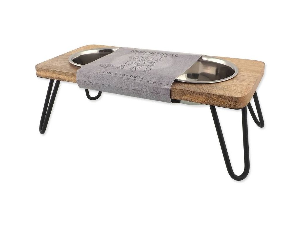 Nerezové misky DOG FANTASY v dřevěném stojánku železné nohy 2x400ml
