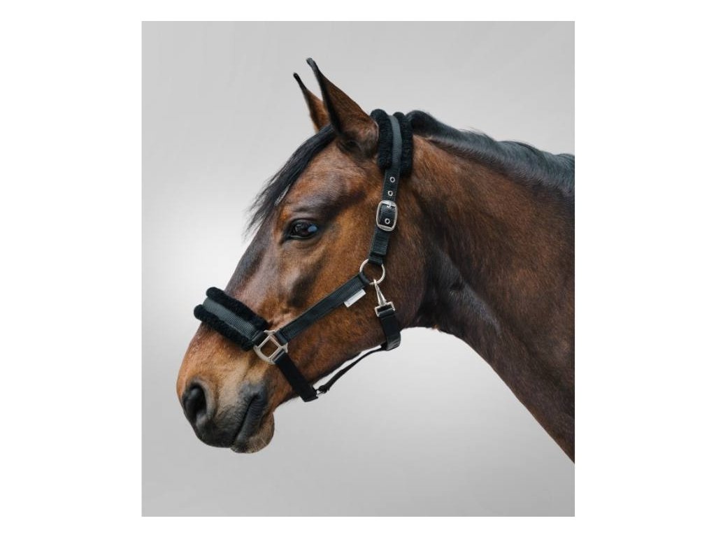 Ohlávka s měkkým polstrováním z umělého beránku na nátylníku a nánosníku. Nastavitelná oboustranně na nátylníku.