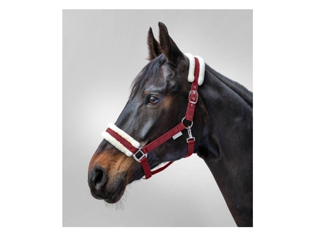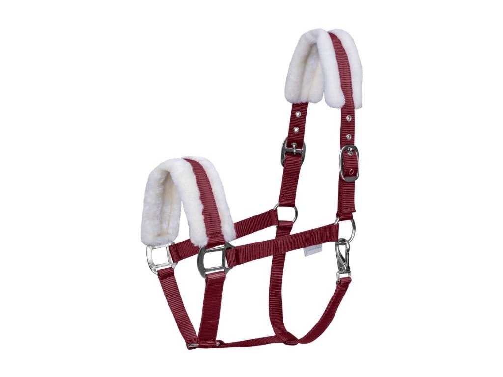 Ohlávka s měkkým polstrováním z umělého beránku na nátylníku a nánosníku. Nastavitelná oboustranně na nátylníku.