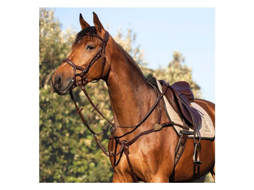 Luxusní anatomicky tvarovaný poprsník z italské telecí kůže fixuje sedlo na koni v pěti bodech.