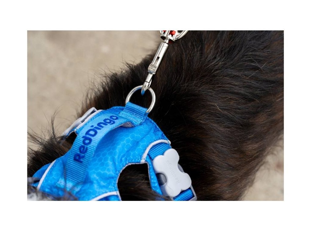 - vybaven dvěma úchyty – kroužek z nerezové oceli na hřbetu postroje slouží k připnutí vodítka, zatímco menší úchyt z pevného plastu na hrudní části je ideální na identifikační známku nebo světýlko
