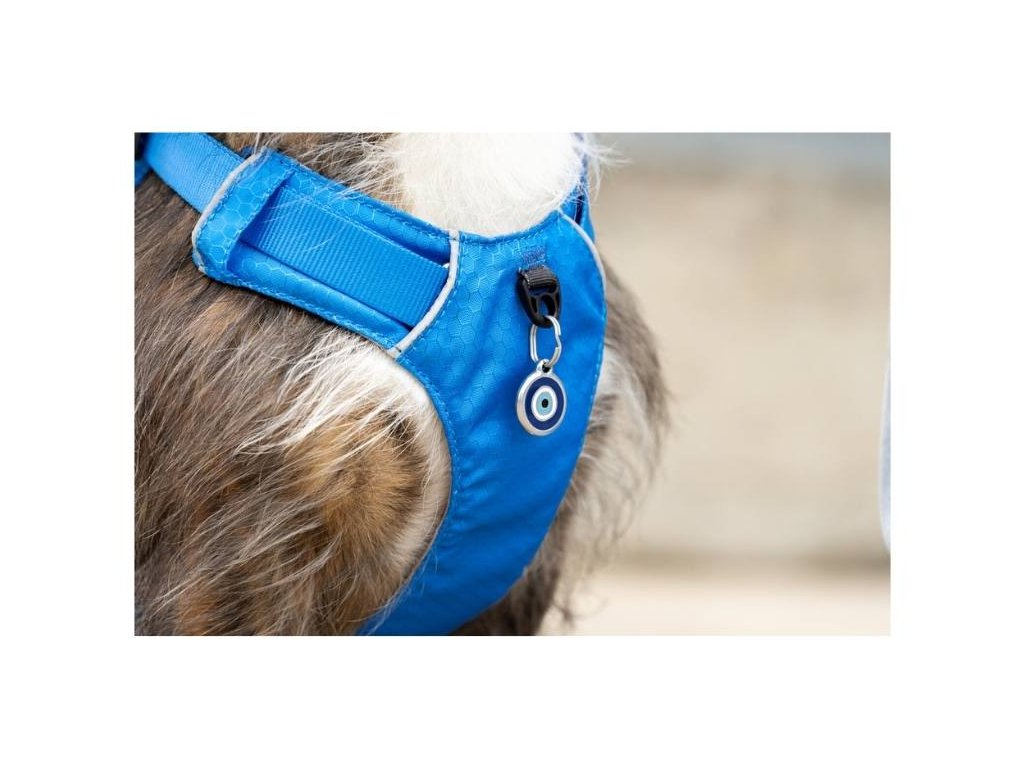 - je vybaven dvěma úchyty – kroužek z nerezové oceli pro připnutí vodítka a plastový na hrudi pro připnutí identifikační známky nebo světýlka