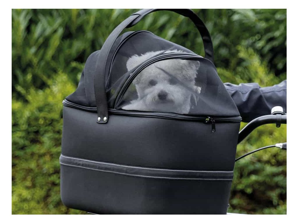 - pevný kovový rám pro bezpečný převoz zvířete na řídítkách kola