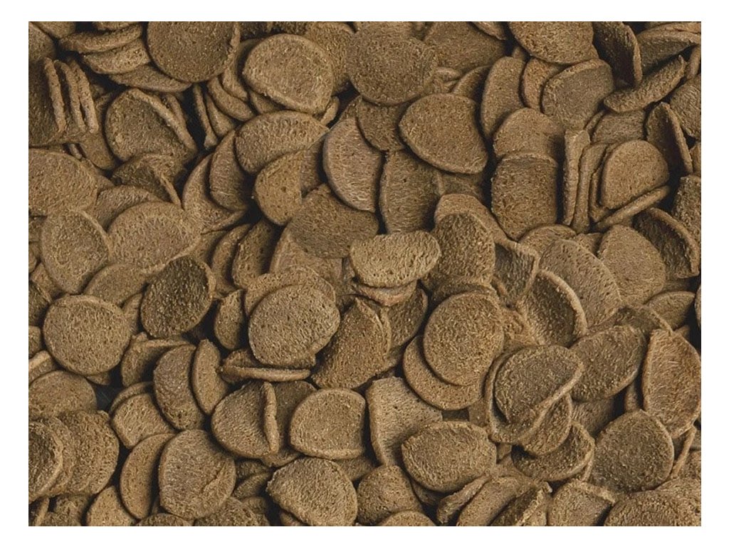 SLOŽENÍ: rybí moučka, pšeničná mouka, kukuřičný škrob, pšeničné klíčky, moučka z hmyzu (Hermetia illucens) (6,5 %), rybí tuk, pivní kvasnice, vaječný prášek, mléčný prášek, Mannan-oligosacharid (0,4 %), vojtěška, kopřivy, petržel, masová moučka ze slávek zelenoústých, moučka z mořských řas, paprika, spirulina, špenát, karoten, řasy Haematococcus, česnek, semena pískavice řeckého sena, semena fenyklu, semena anýzu