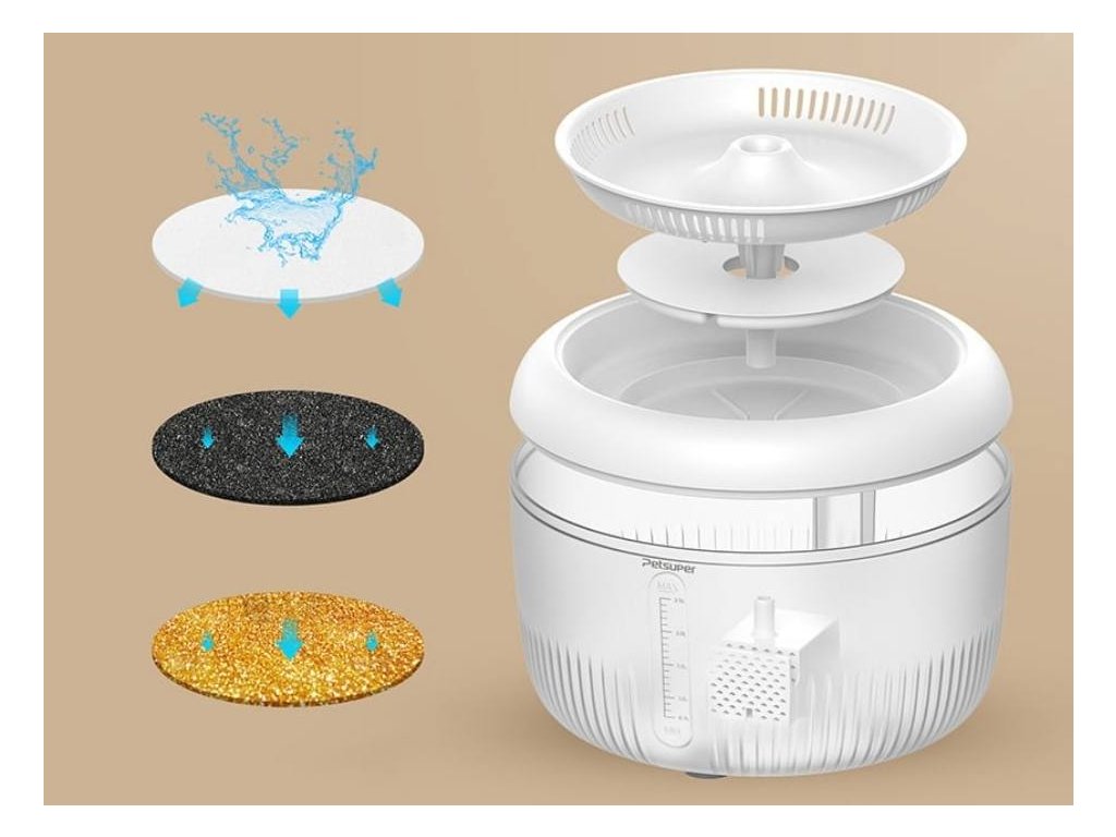 FILTRAČNÍ SYSTÉM: Fontána využívá pokročilý filtrační systém, který účinně odstraňuje chlupy, zbytky jídla, těžké kovy a další škodlivé částice.