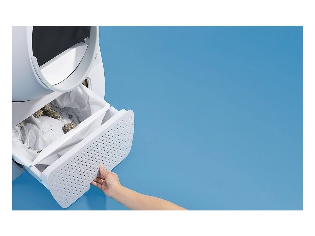 Kapacita odpadkového boxu je celých 13 l, což vystačí až na 14 dní používání jednou kočkou nebo asi 7 dní pro 2-3 kočky. Díky tomu už nemusíte vynášet odpad každý den. Odpadní box je umístěn v přední části zařízení, což značně usnadňuje jeho vyprazdňování. Jednoduše vyjměte zásuvku, vyhoďte starý sáček na stelivo a poté vložte nový.