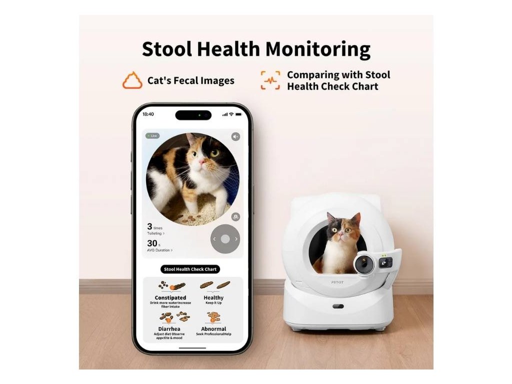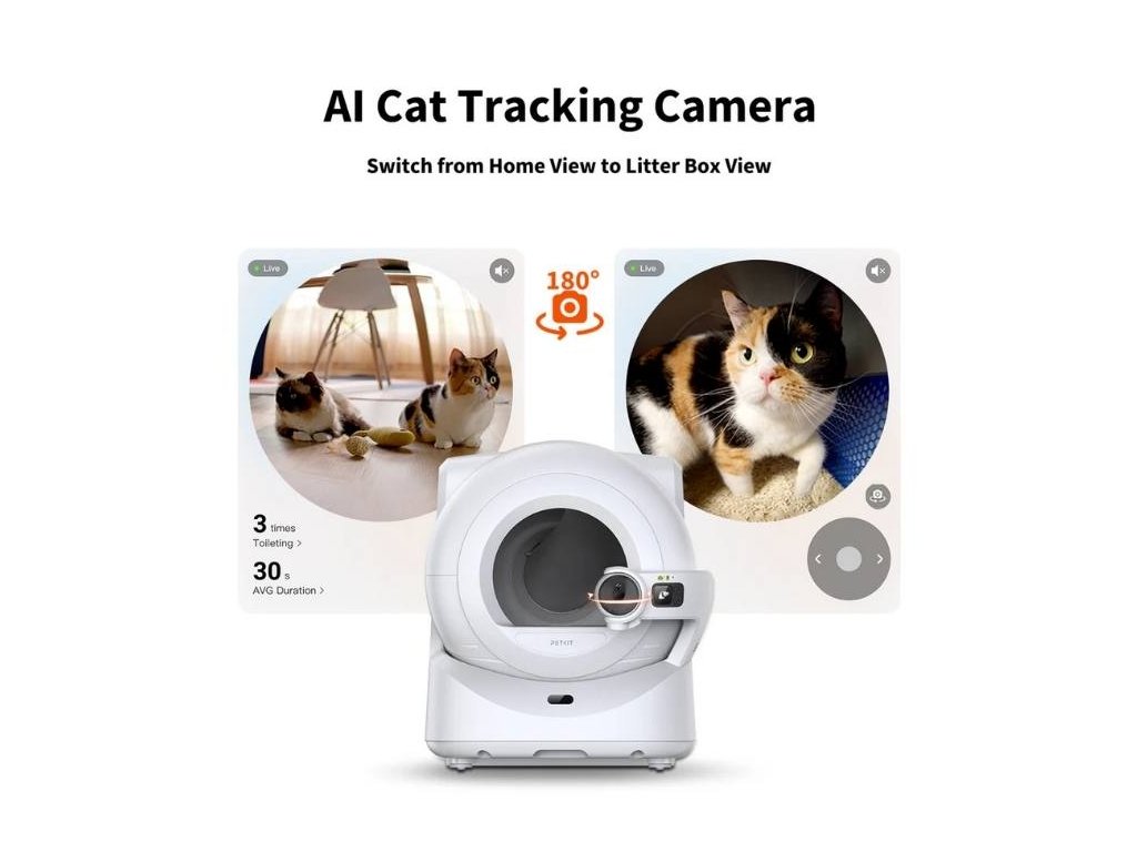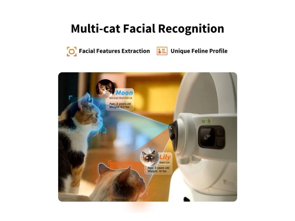 Vestavěná kamera AI s rozlišením 1080p, která se otáčí o 180° a nabízí 210° zorné pole, umožňuje pohodlně sledovat chování vašeho domácího mazlíčka uvnitř i vně toalety. Systém přesně identifikuje každou kočku pomocí technologie rozpoznávání obličeje a analyzuje její jedinečné rysy, velikost těla a vzor srsti.