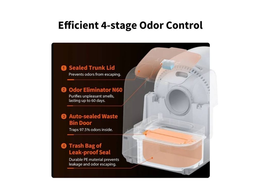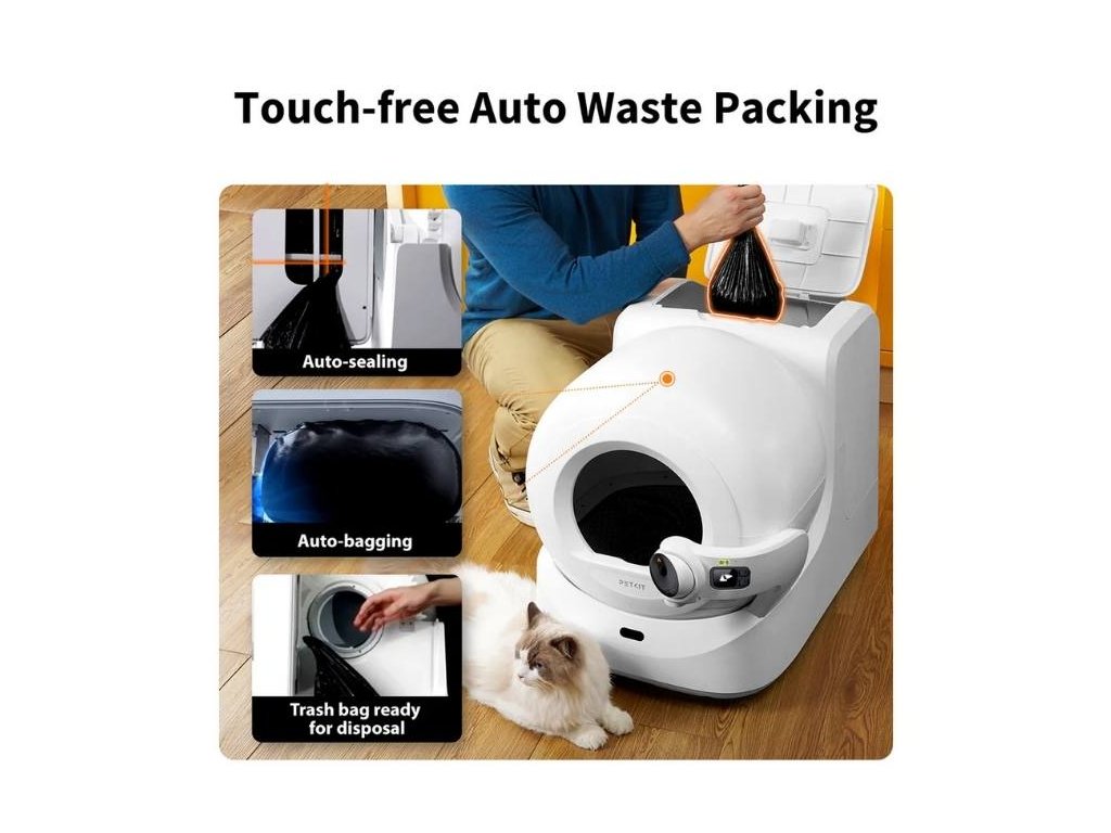Je vybavena 1080p otočnou kamerou s umělou inteligencí, automatickým systémem balení a likvidace odpadu. Zařízení je zároveň plně bezpečné pro domácí mazlíčky a eliminuje problém nepříjemného zápachu.