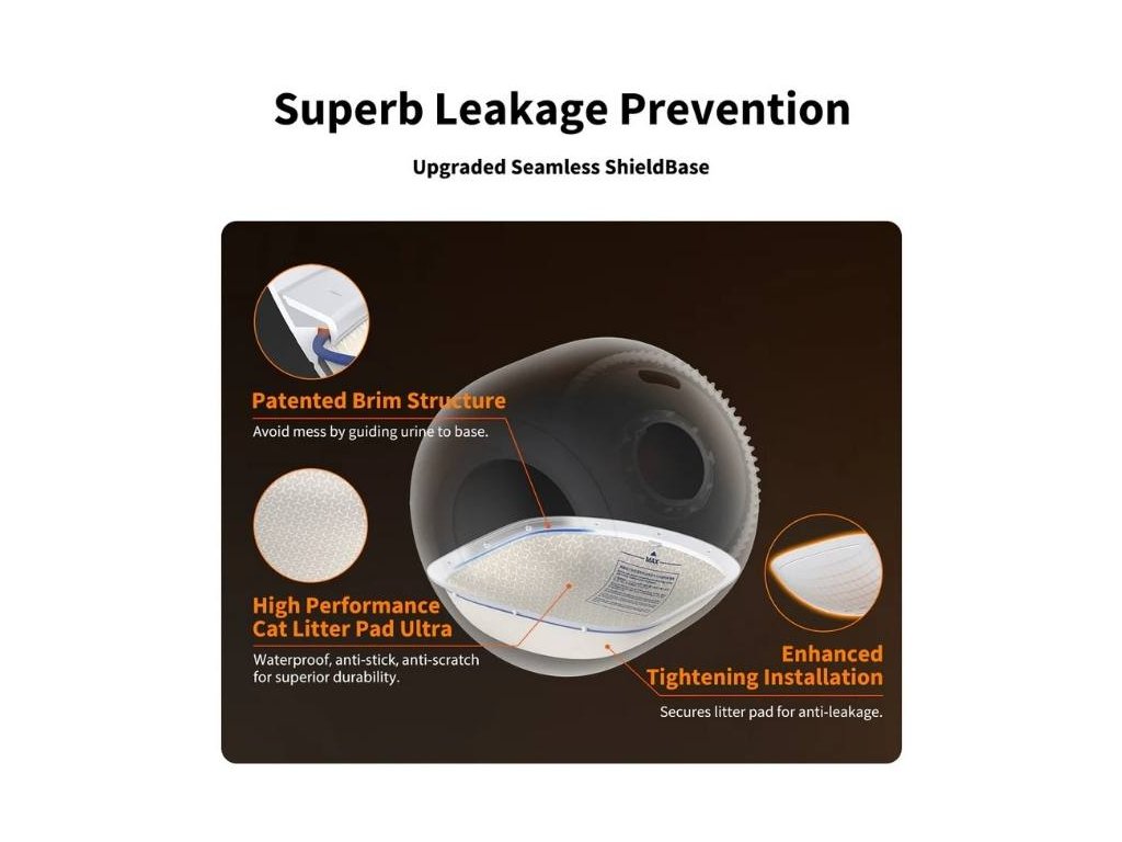 Až 20 přesných senzorů zajišťuje naprostou bezpečnost vašeho domácího mazlíčka. Systém okamžitě zastaví provoz toalety, pokud zjistí přítomnost kočky, čímž eliminuje riziko zaseknutí nebo zranění. Vylepšený válec navíc využívá řešení ShieldBase, které zaručuje úplné utěsnění a účinně zabraňuje úniku.