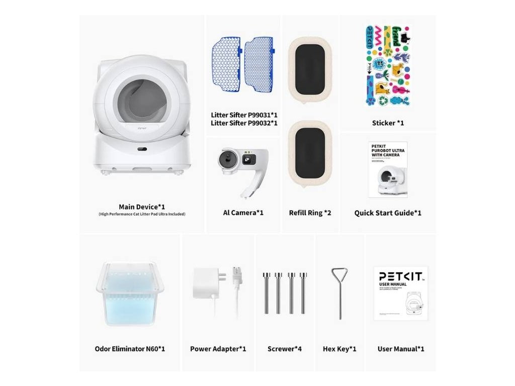 BALENÍ: toaleta, sítko na stelivo 2x (2 typy), kamera s umělou inteligencí, sada samolepek, doplňovací kroužek 2x, neutralizátor zápachu N60, napájecí adaptér, šroub x4, imbusový klíč, uživatelská příručka, stručný návod k použití