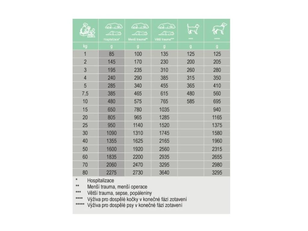 NÁVOD K POUŽITÍ: Individuální denní krmná dávka je závislá na klinickém stavu psa nebo kočky a na mnoha dalších faktorech, jako jsou např.: plemeno, vlivy prostředí, roční období, aktivita apod. Doporučuje se proto průběžně monitorovat klinický stav a tělesnou hmotnost psa nebo kočky a krmnou dávku upravit dle jejich individuálních nároků a potřeb.
